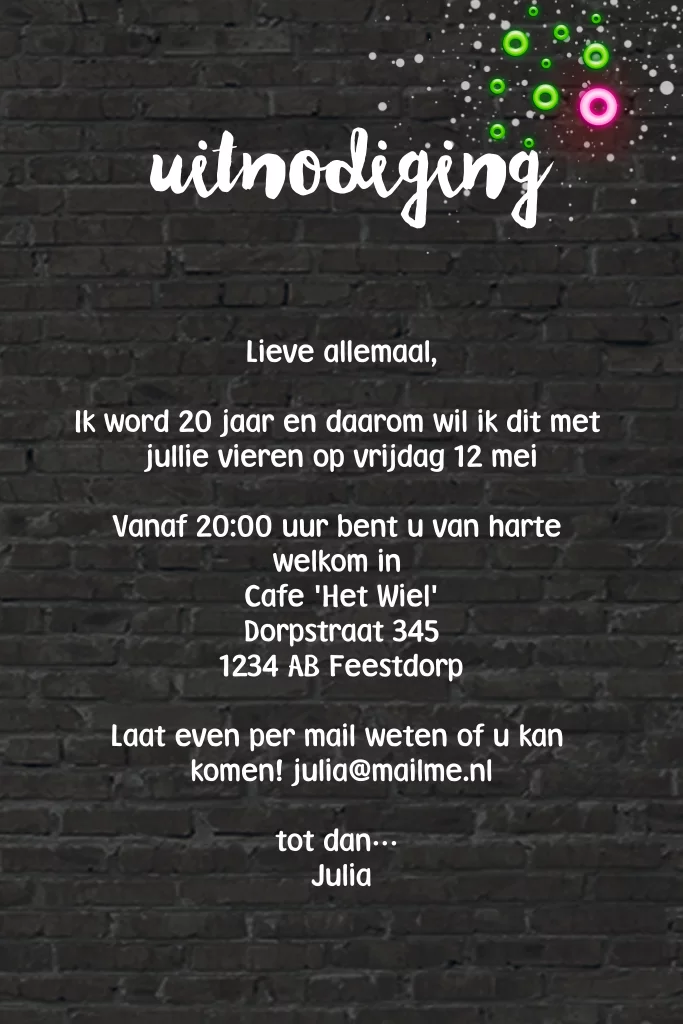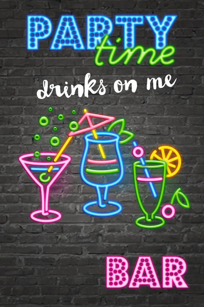 Moderne uitnodiging met stoere neon verlichting party time, bar en cocktails voor een cocktail feestje. (5274)