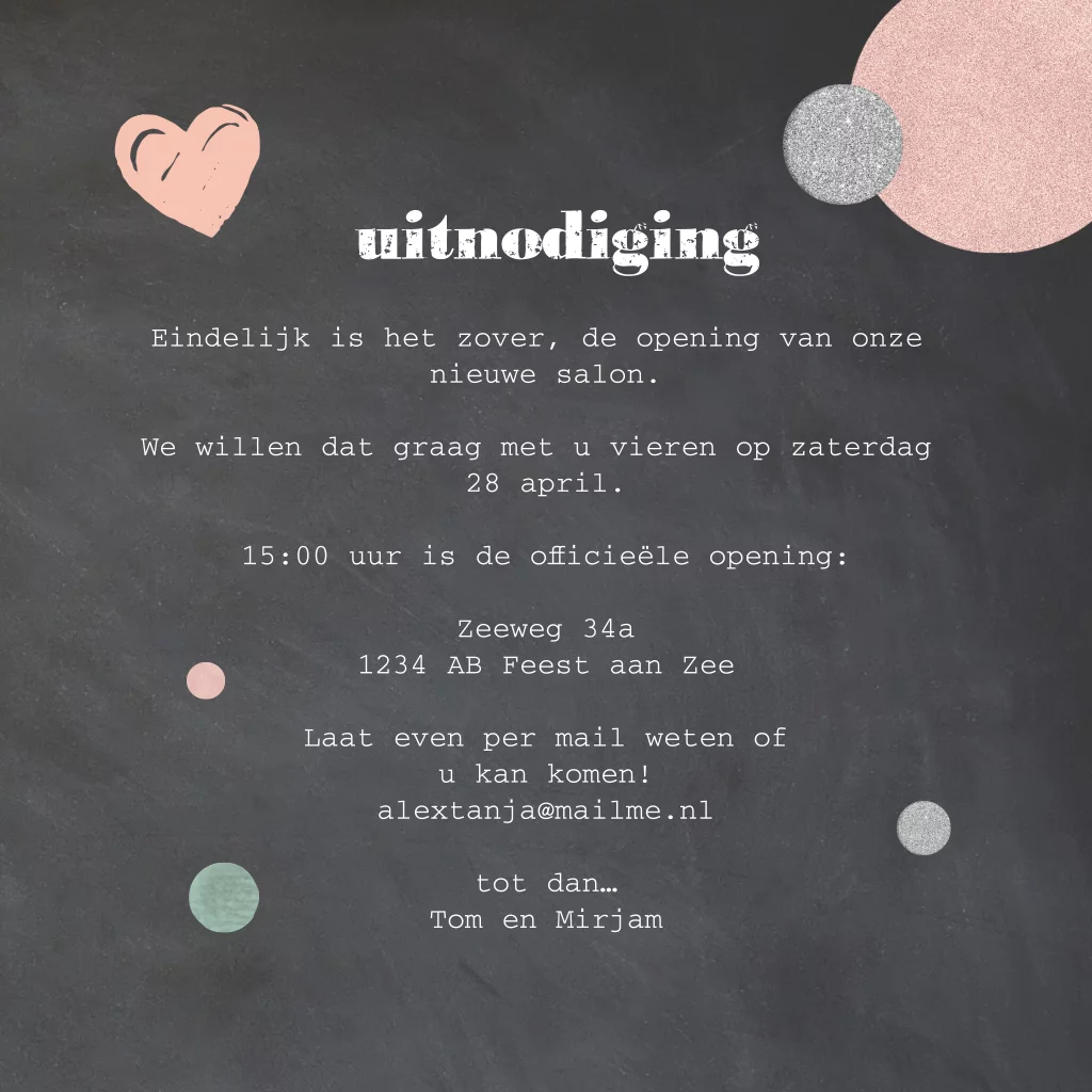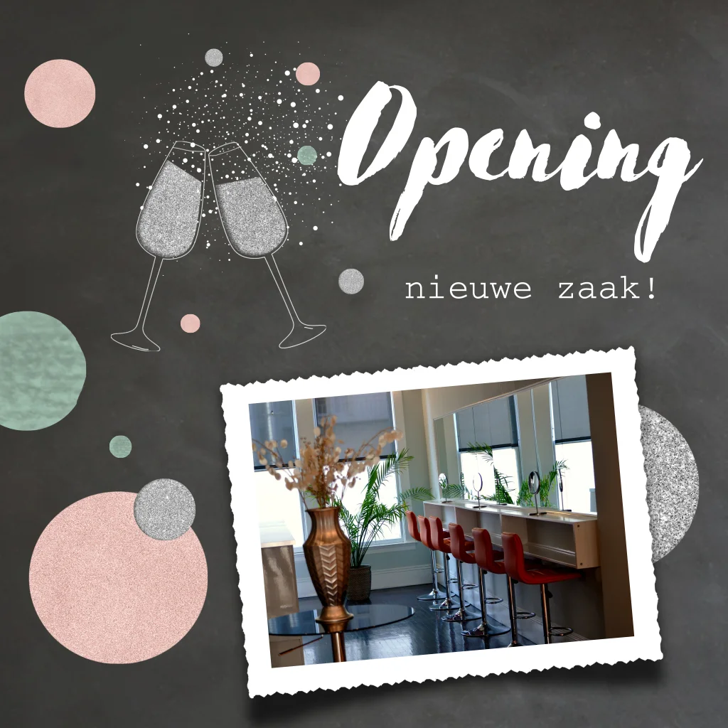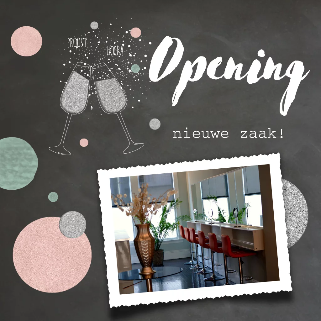 Opening uitnodiging met foto en zilveren glitter glazen voor een salon, kapperszaak, nagelstudio of restaurant te gebruiken.