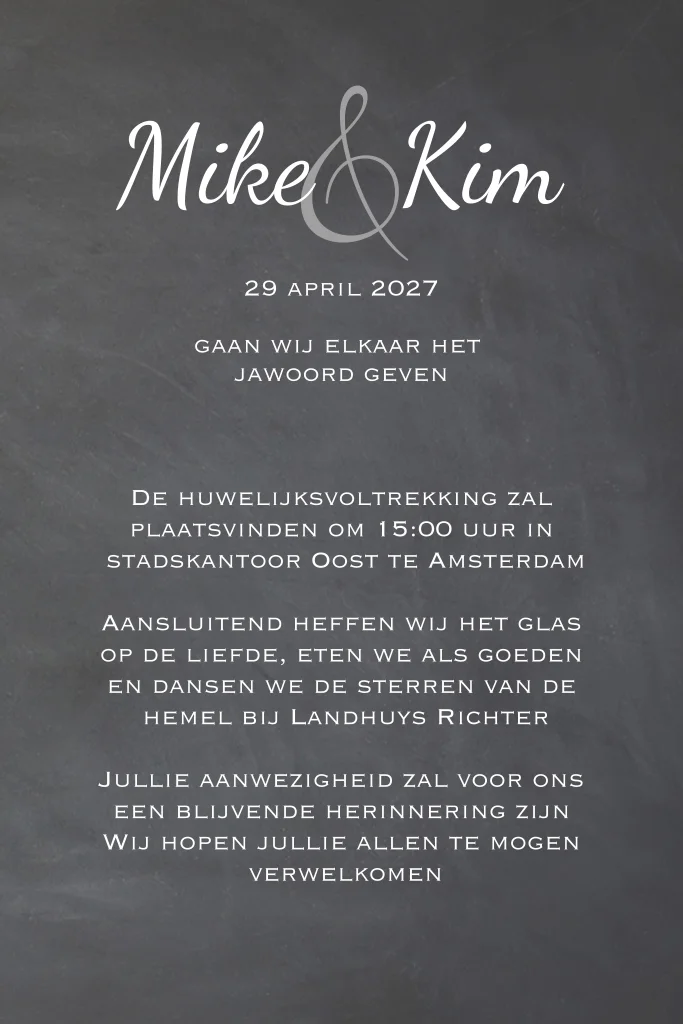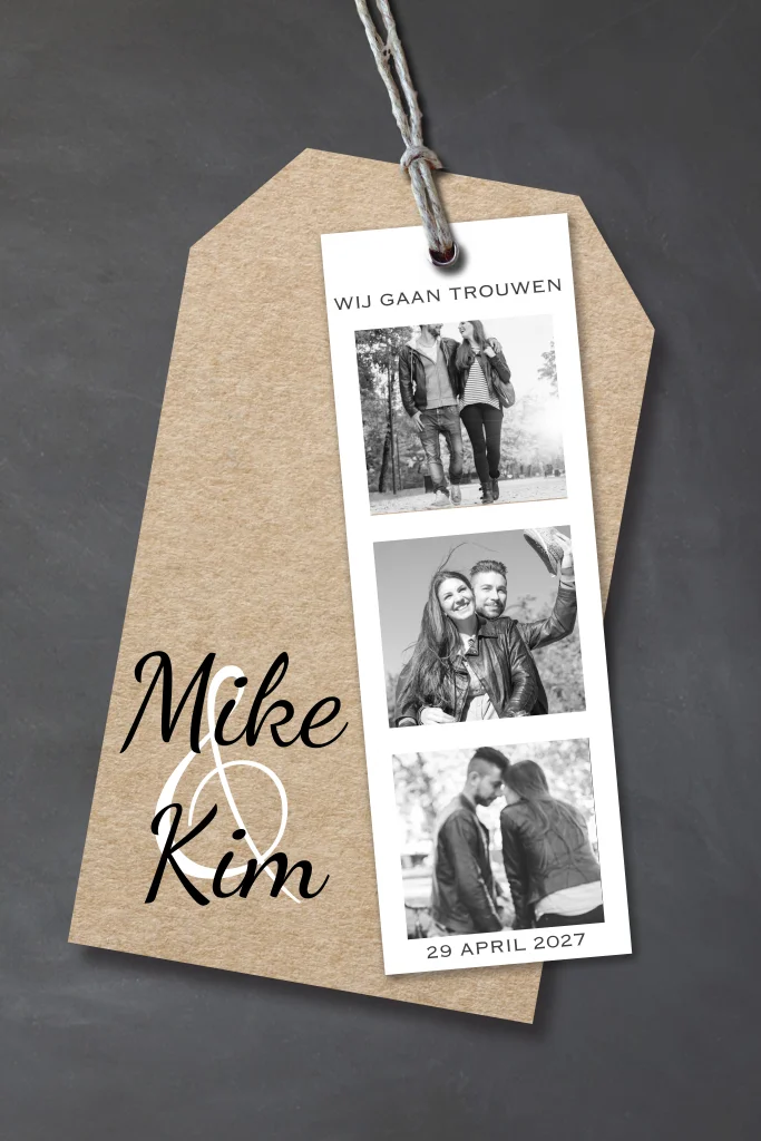 Trouwkaart met eigen foto's? Leuke kaart voor jullie bruiloft met kraft label en foto strip op een ondergrond van krijtbord print. (3228)