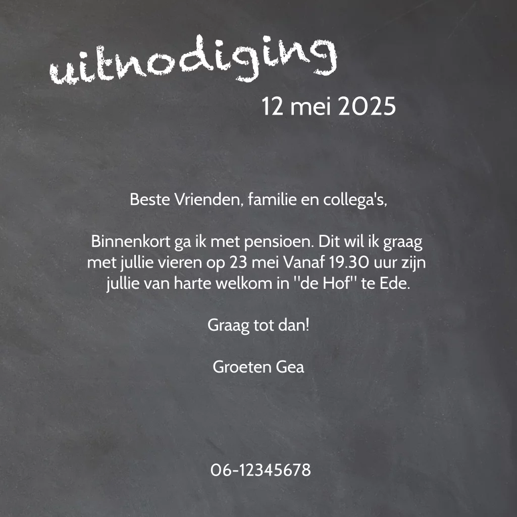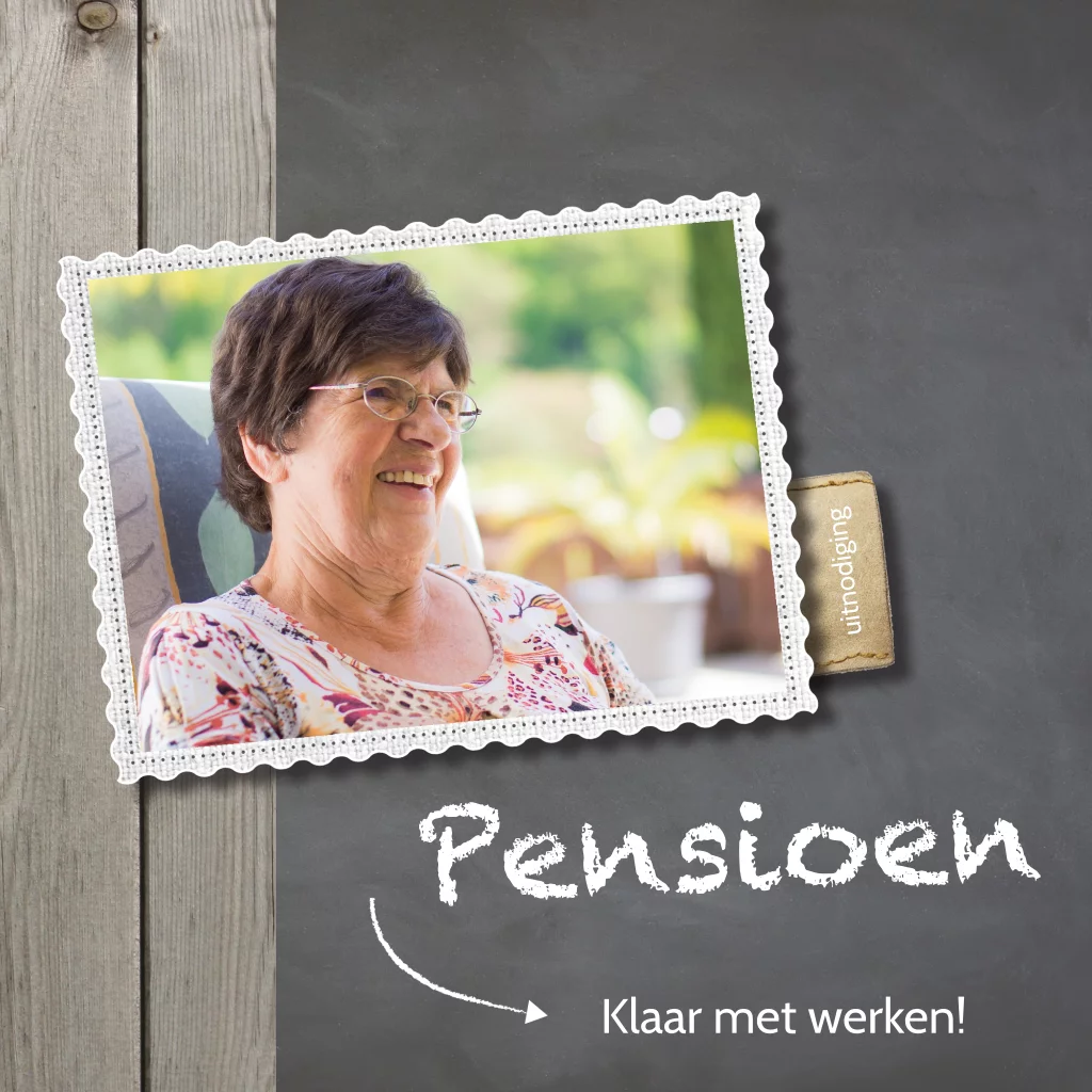 Stijlvolle pensioen uitnodiging vrouw met hout en krijtbord