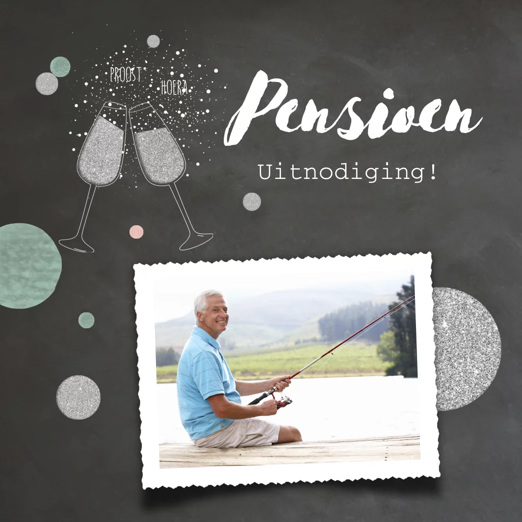Pensioen uitnodiging foto en zilveren glitter glazen