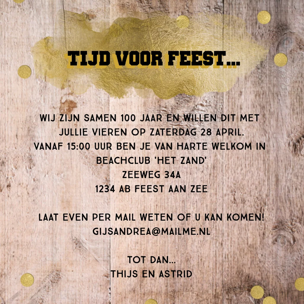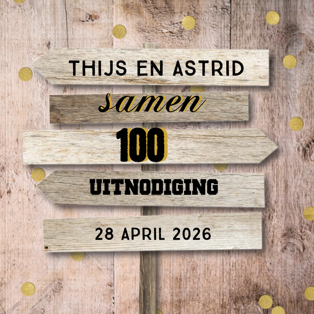Uitnodiging samen 100 met houten bord en confetti. (6441)