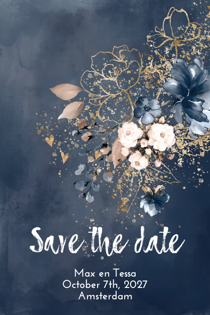 Save the date kaart blauw met bloemen en goud