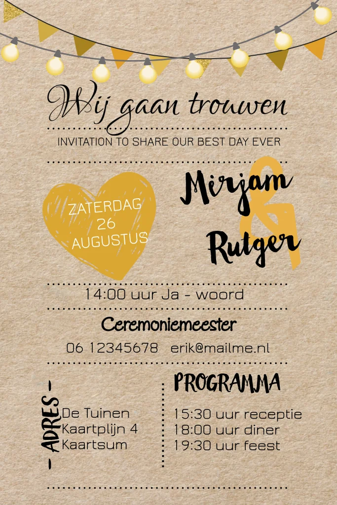 Trouwkaart met bruine achtergrond. Slinger met lichtjes. Alles staat los op dit kaartje en is te bewerken. (5168) Wil je deze kaart maar dan dubbel zodat je meer ruimte hebt? Dat kan! Neem daarvoor contact met ons op.