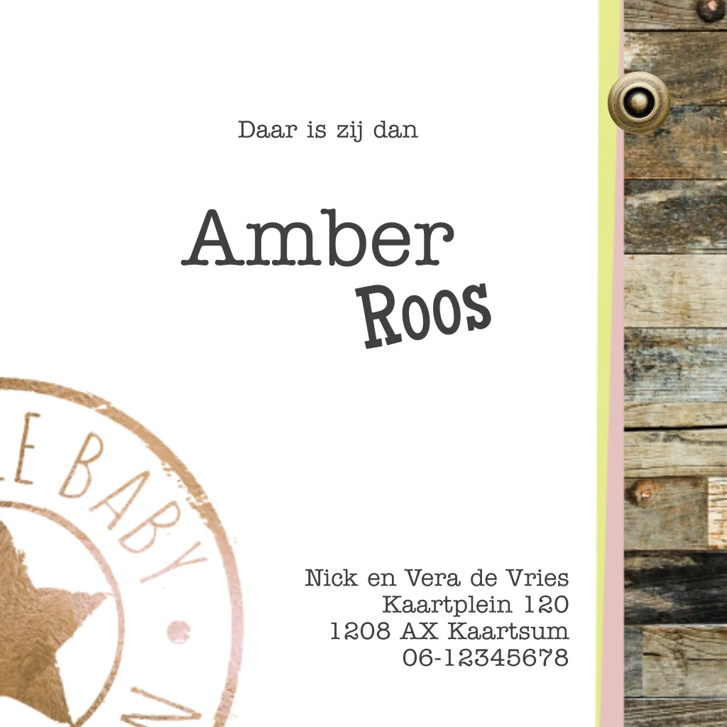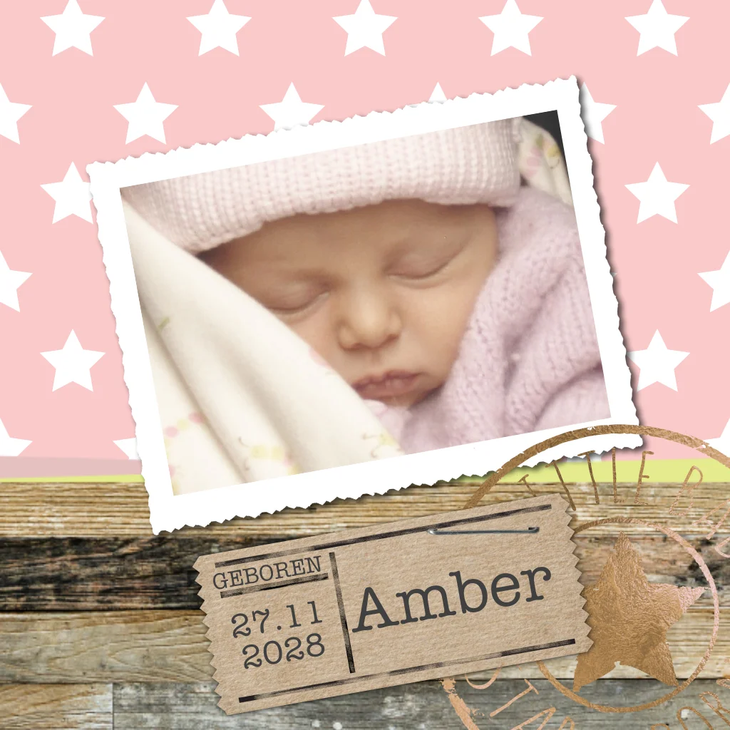Eigentijds foto geboortekaartje meisje met kraft label en stempels. Lekker hip en stoer! (3324)