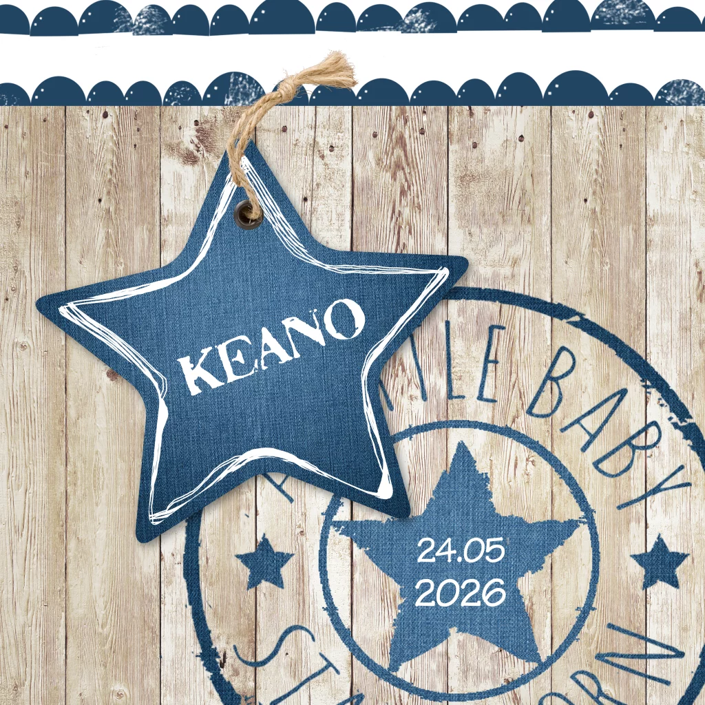 Stoer geboortekaartje voor een jongen met spijkerstof, steigerhout en ster. (3427)