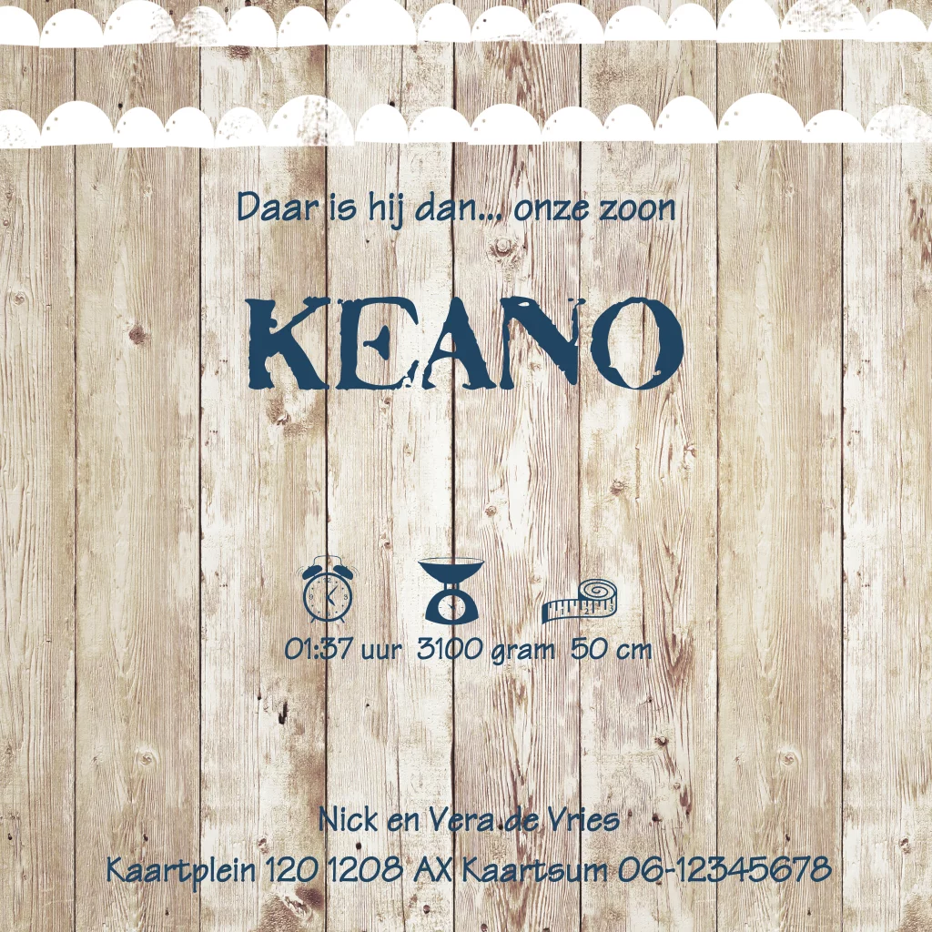 Geboortekaart jongen stoer met spijkerstof en steigerhout