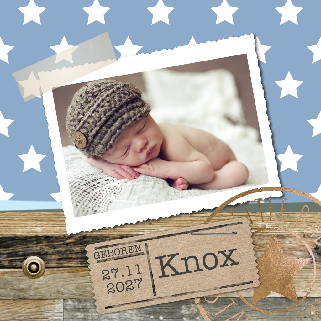 Eigentijdse geboortekaart voor jongen steigerhout en stempels. (3323)