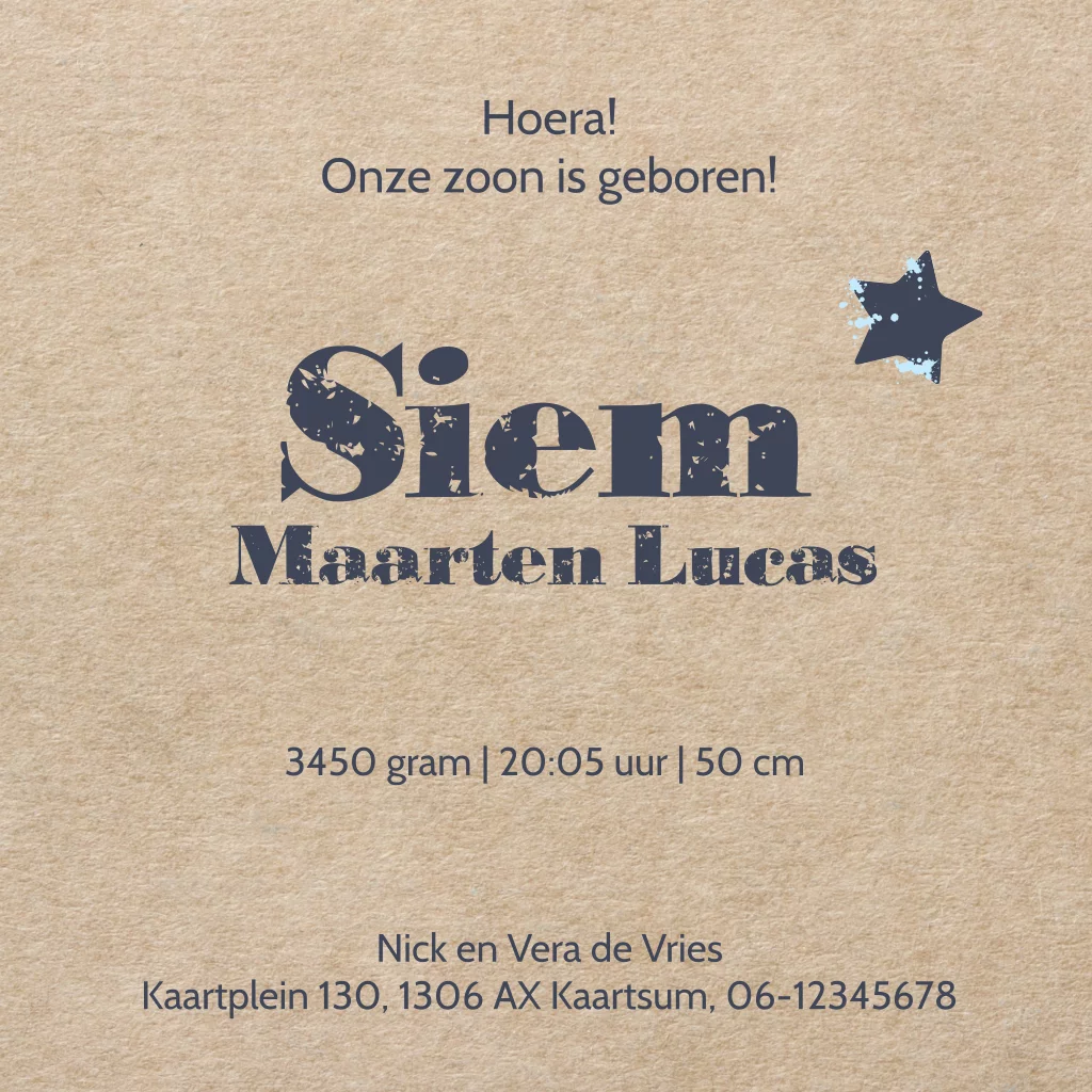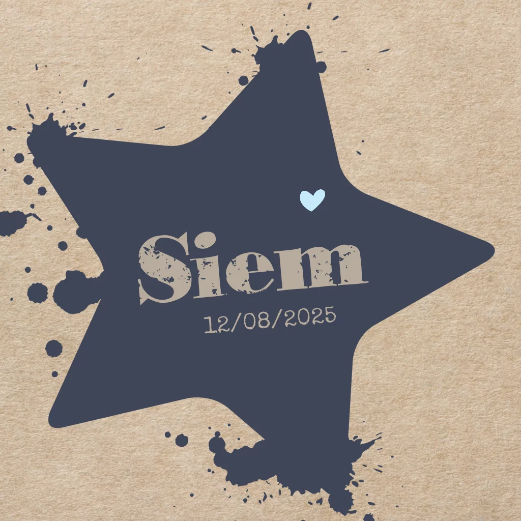 Stoere geboortekaart jongen met verf ster op bruin karton