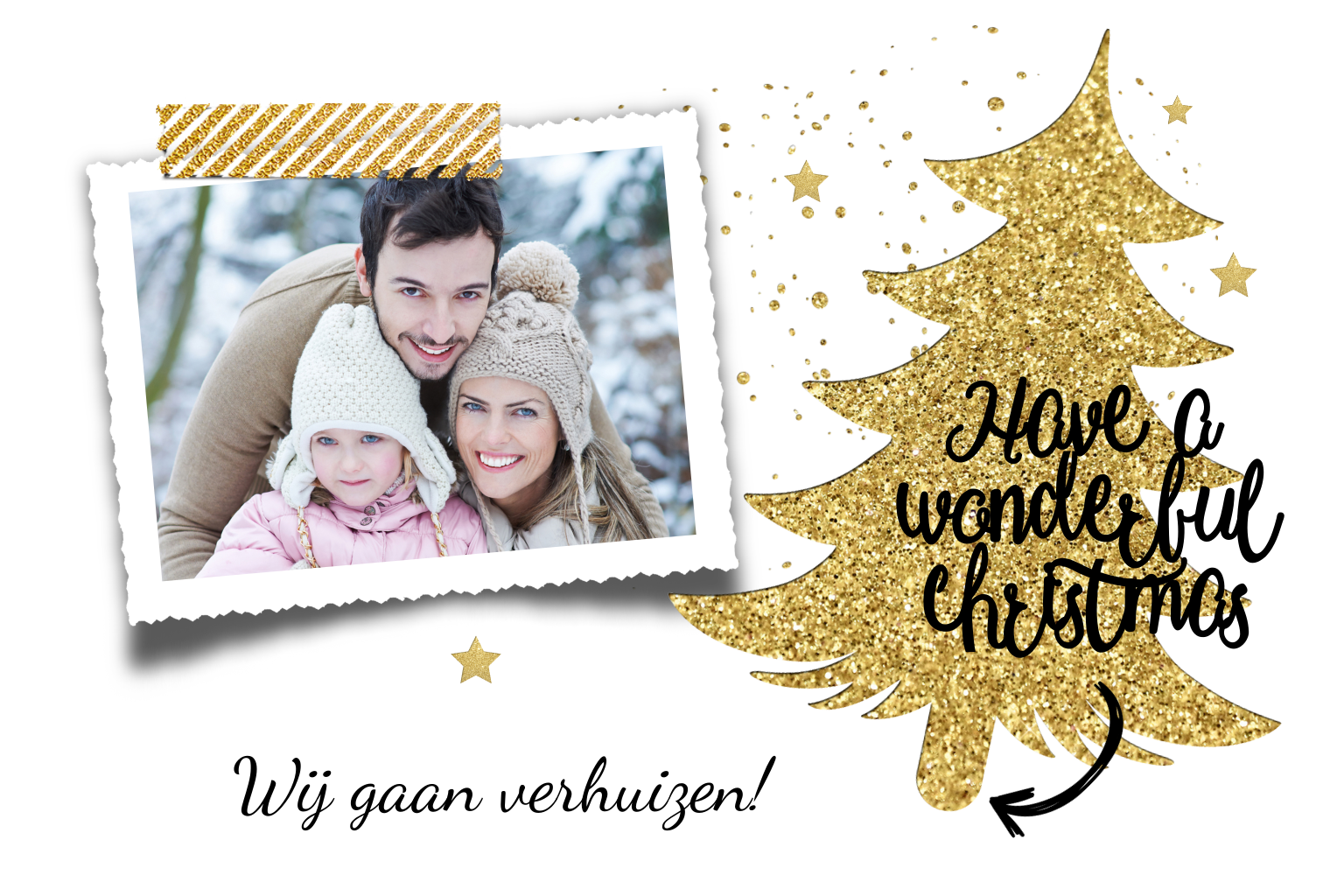 Luxe kerst verhuisbericht met witte achtergrond. Versierd met kerstboom en sterren in glitter goudkleur en eigen foto. Alles staat los op dit kaartje en is te bewerken. (3938)