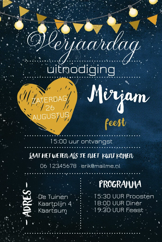 Hippe uitnodiging verjaardag feestje blauw met lichtsnoer. Alles staat los op dit kaartje en is te bewerken. (5371)