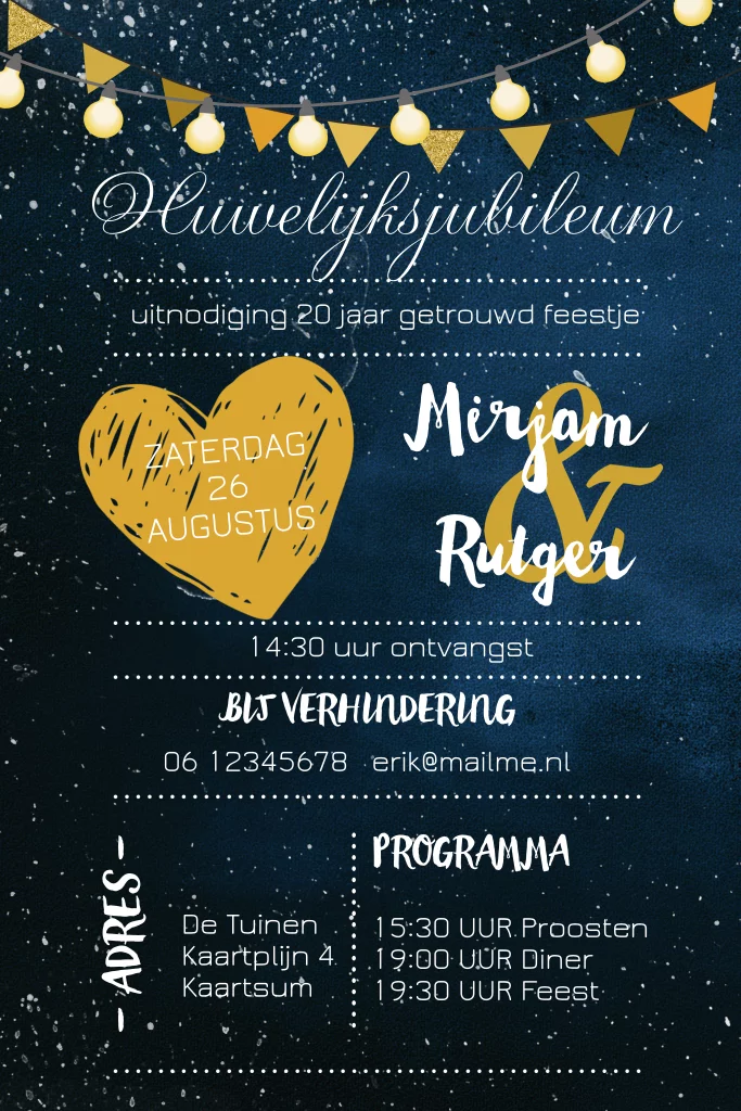 Uitnodiging voor een feestje voor een huwelijksjubileum 20 jaar getrouwd blauw met lichtsnoer. Alles staat los op dit kaartje en is te bewerken. (5371)