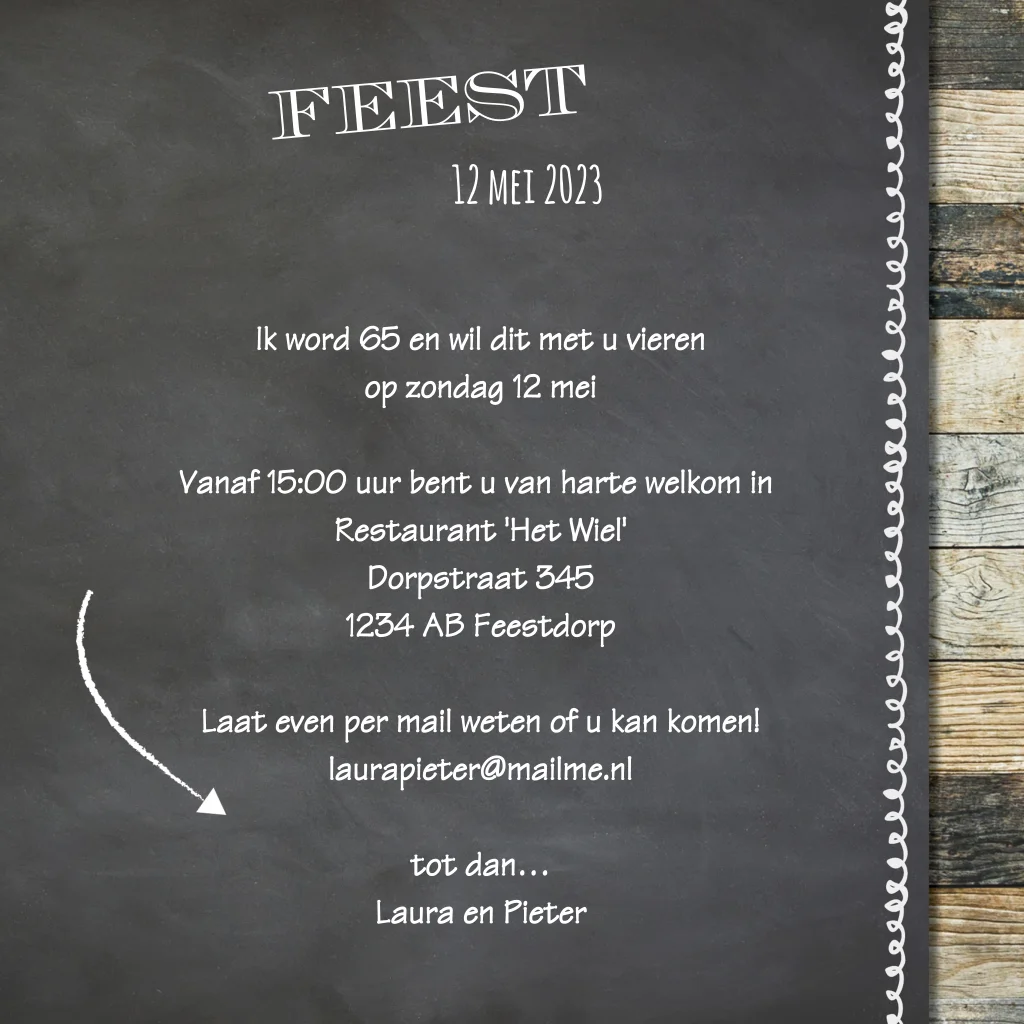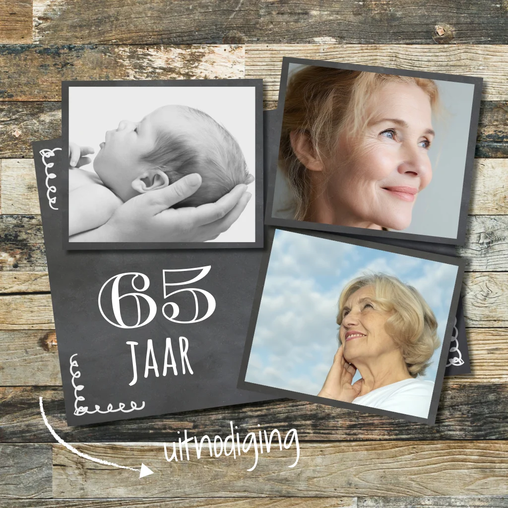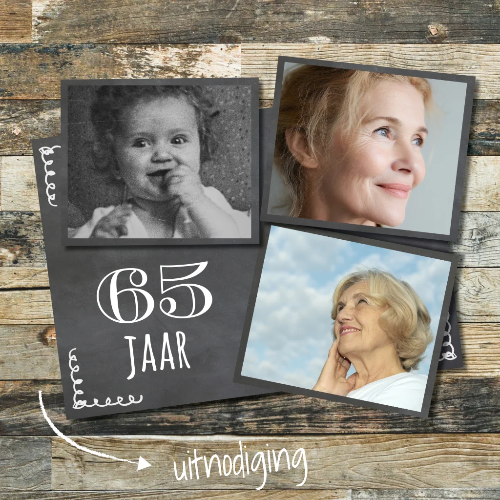Trendy uitnodigingskaart vijfenzestigste verjaardag met foto nu en vroeger. Krijtbord aan de binnenzijde. (1731)