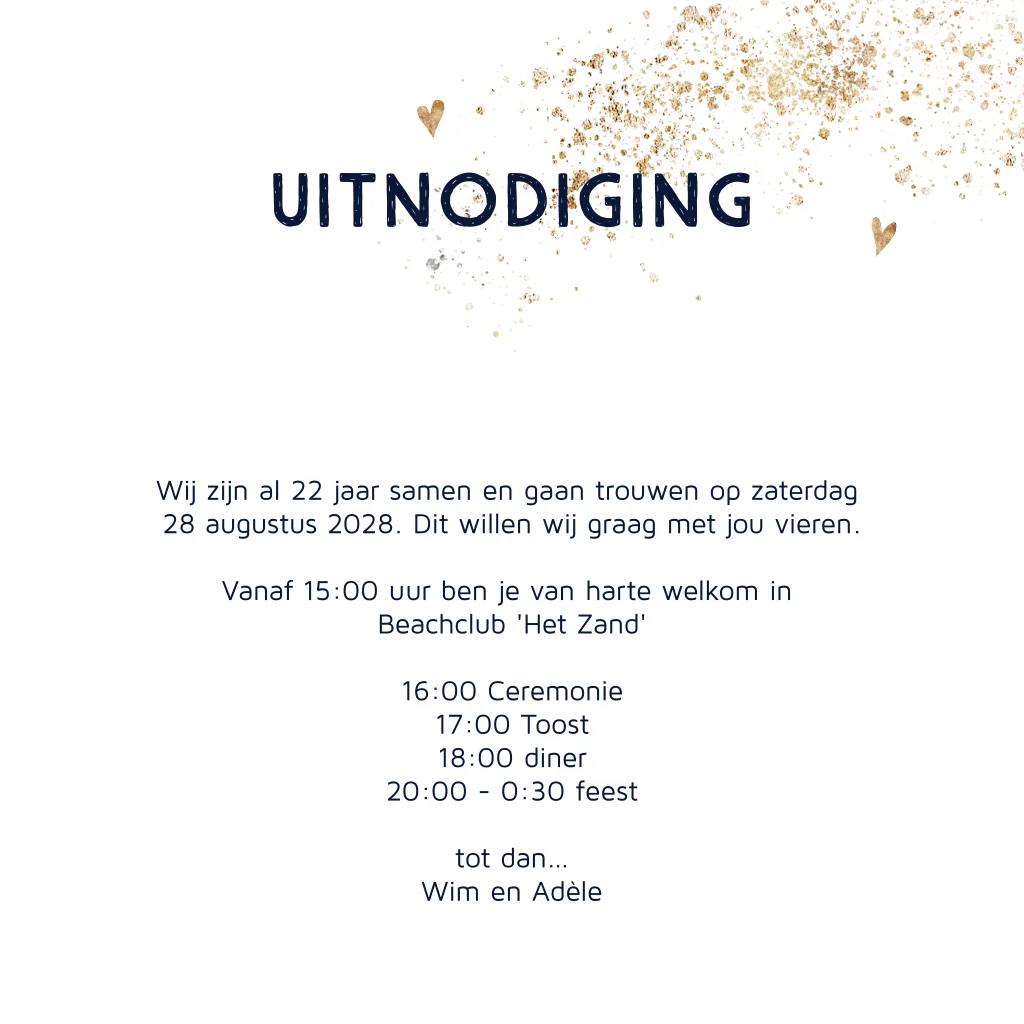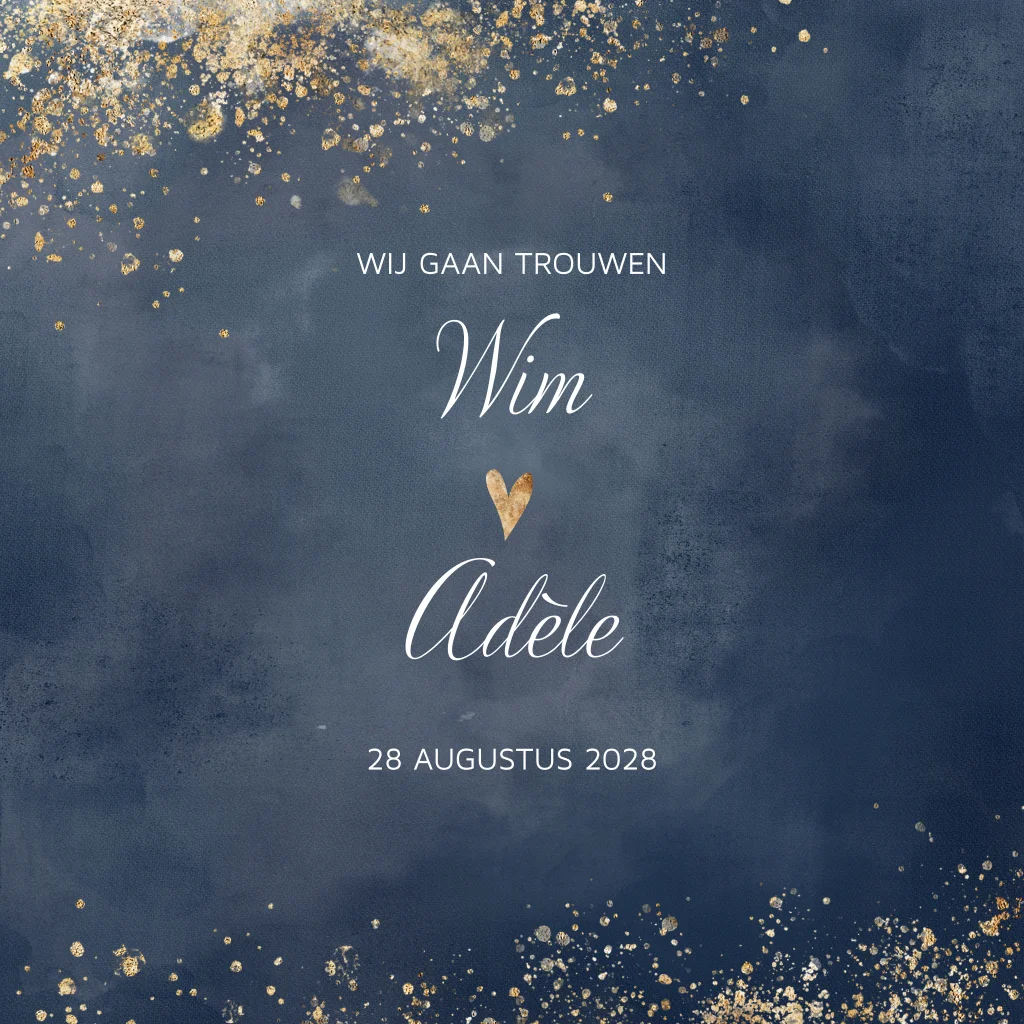 Trouwkaart blauw met goud-look spetters/ Mooie donkerblauwe kleur en strak en klassiek lettertype gemixt. (9931)