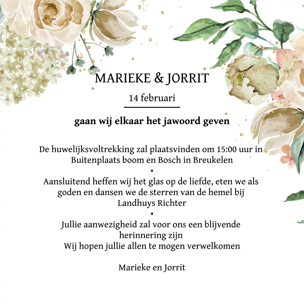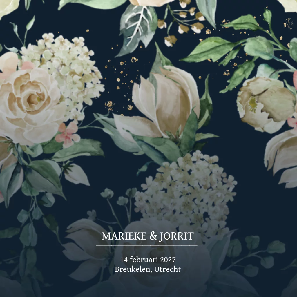 Trouwkaart blauw met witte groot boekt van mooie bloemen met een klassieke touch. (8142)