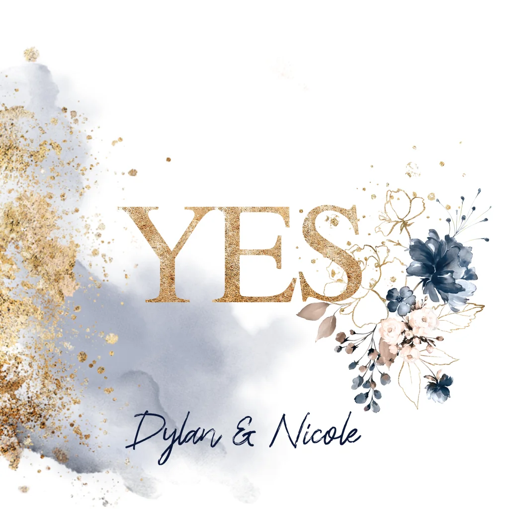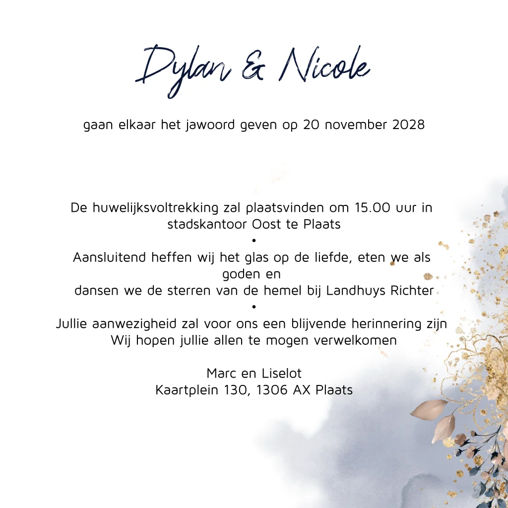 Trouwkaart met lichtblauw parelmoer kleur pastel met verf en goud spetters (8144)