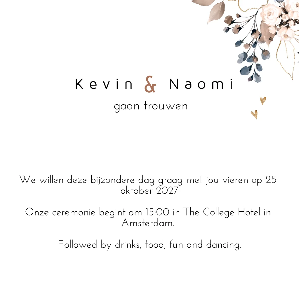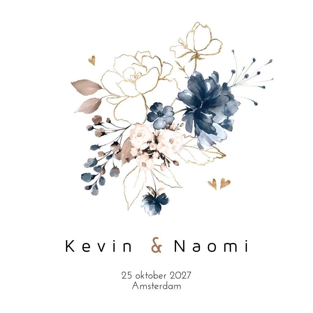 Trouwkaart bloemen blauw en goud