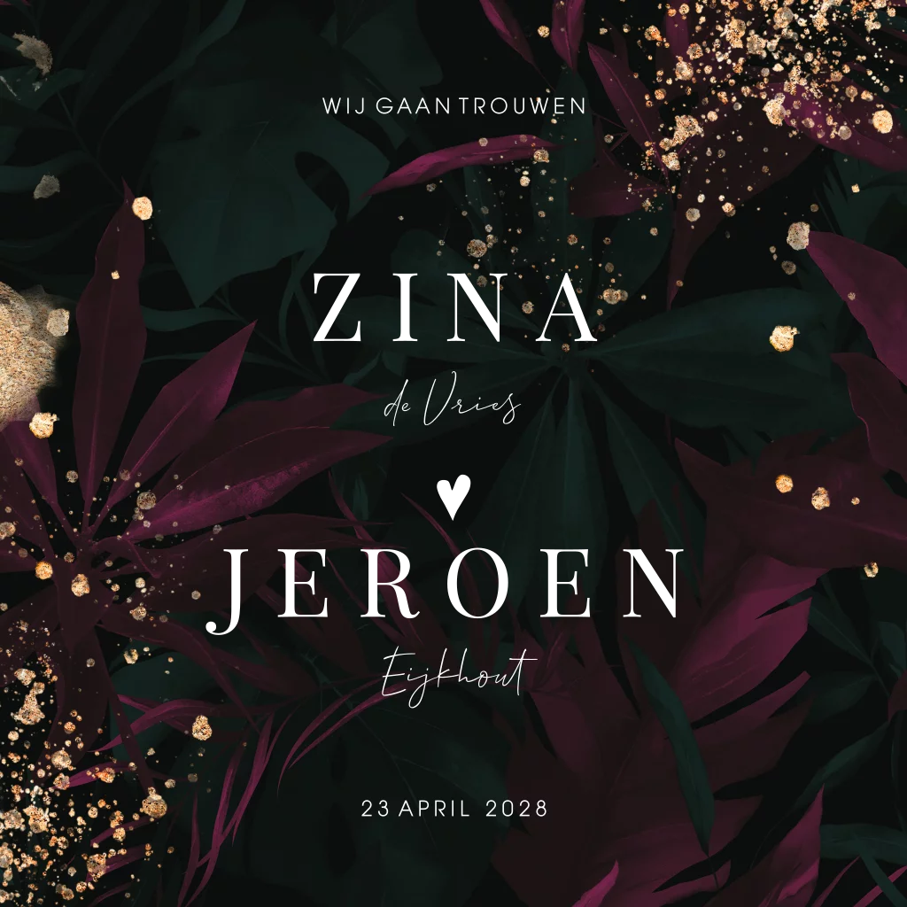 Een mooi voorbeeld van een moderne trouwkaart in luxe botanische sferen met glitters en donkerrode bladeren. De namen staan in glimmende goudfolie foliedruk. (24213)