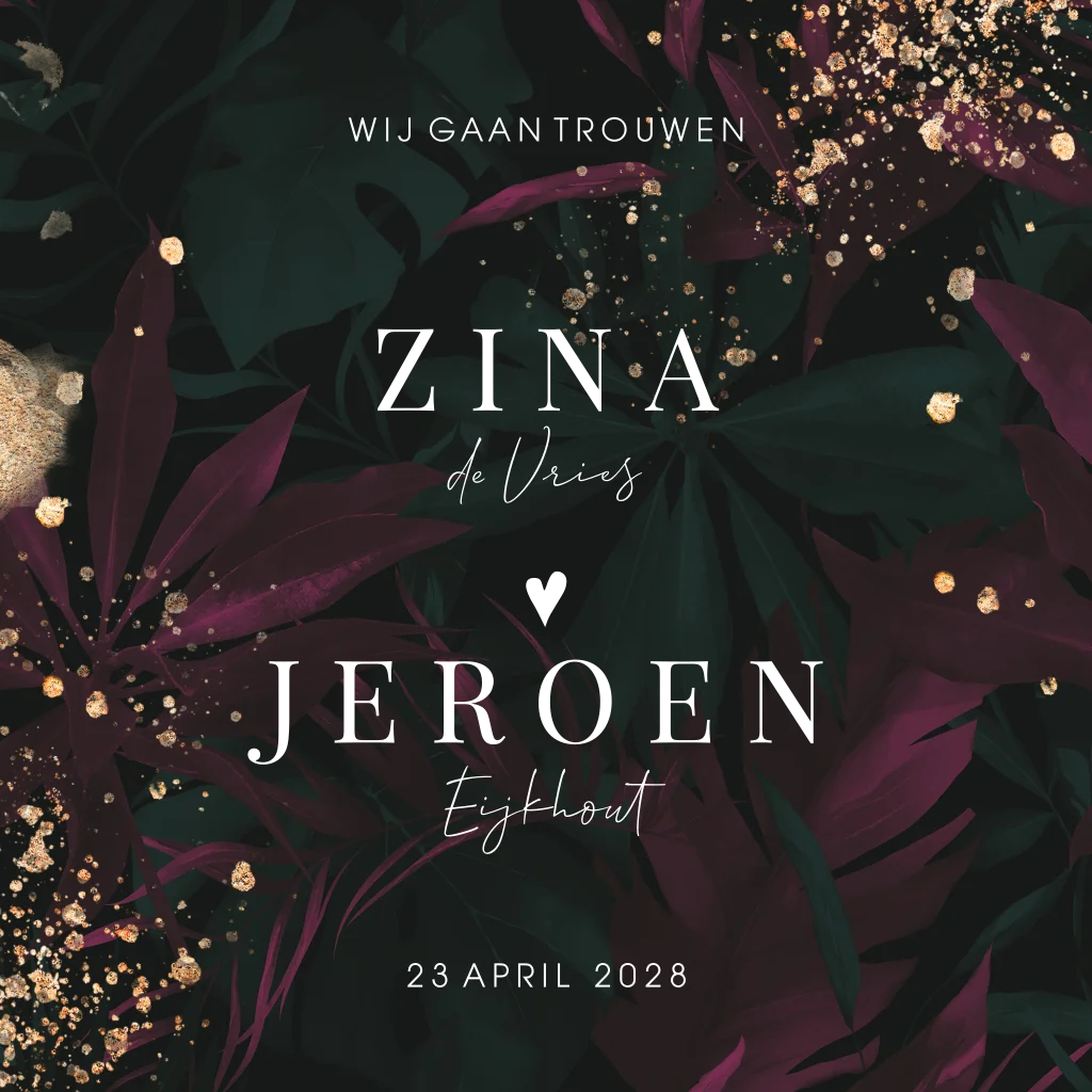 Een voorbeeld van een moderne trouwkaart in luxe botanische sferen met glitters en donkerrode bladeren. De namen staan in glimmende goudfolie foliedruk. (24213)