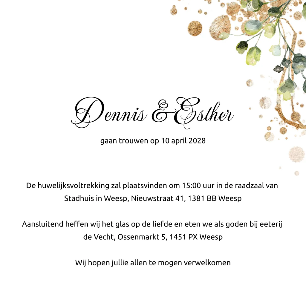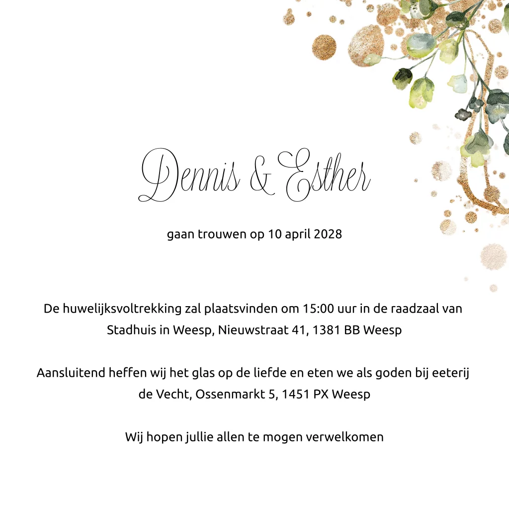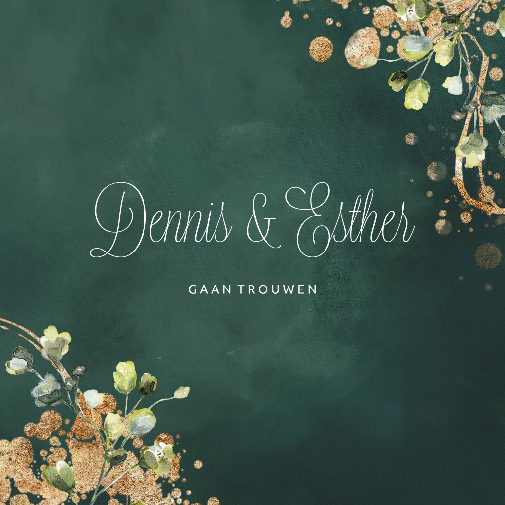 Trouwkaart botanisch groen met bloemen en goudfolie