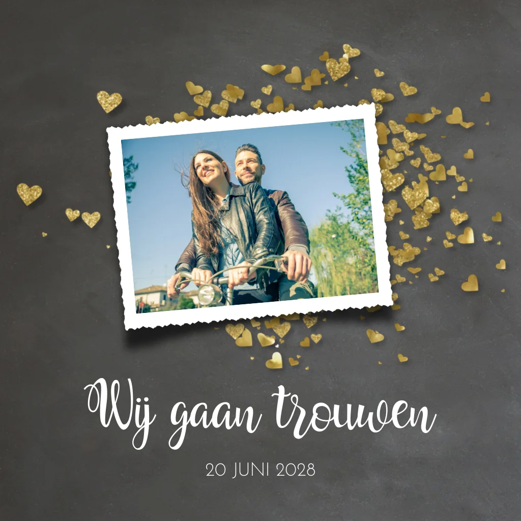 Trouwkaart met krijtbord en goudkleurige hartjes tekst 'wij gaan trouwen'