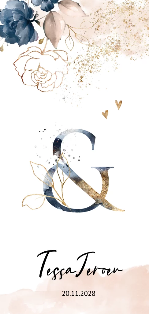 Hippe Trouwkaart en-teken ampersand-teken versierd met takjes / bladeren en bloemen. De hoofdkleuren zijn pastel roze en blauw (8153)