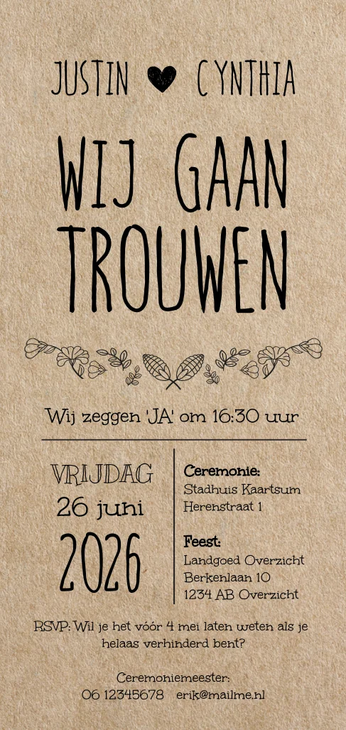 Trouwkaart kraft-look achtergrond hip en moderne details en stoer langwerpig formaat van 21 cm hoog en 10 cm breed. (8154) Wil je deze kaart maar dan dubbel zodat je meer ruimte hebt? Dat kan! Neem daarvoor contact met ons op.