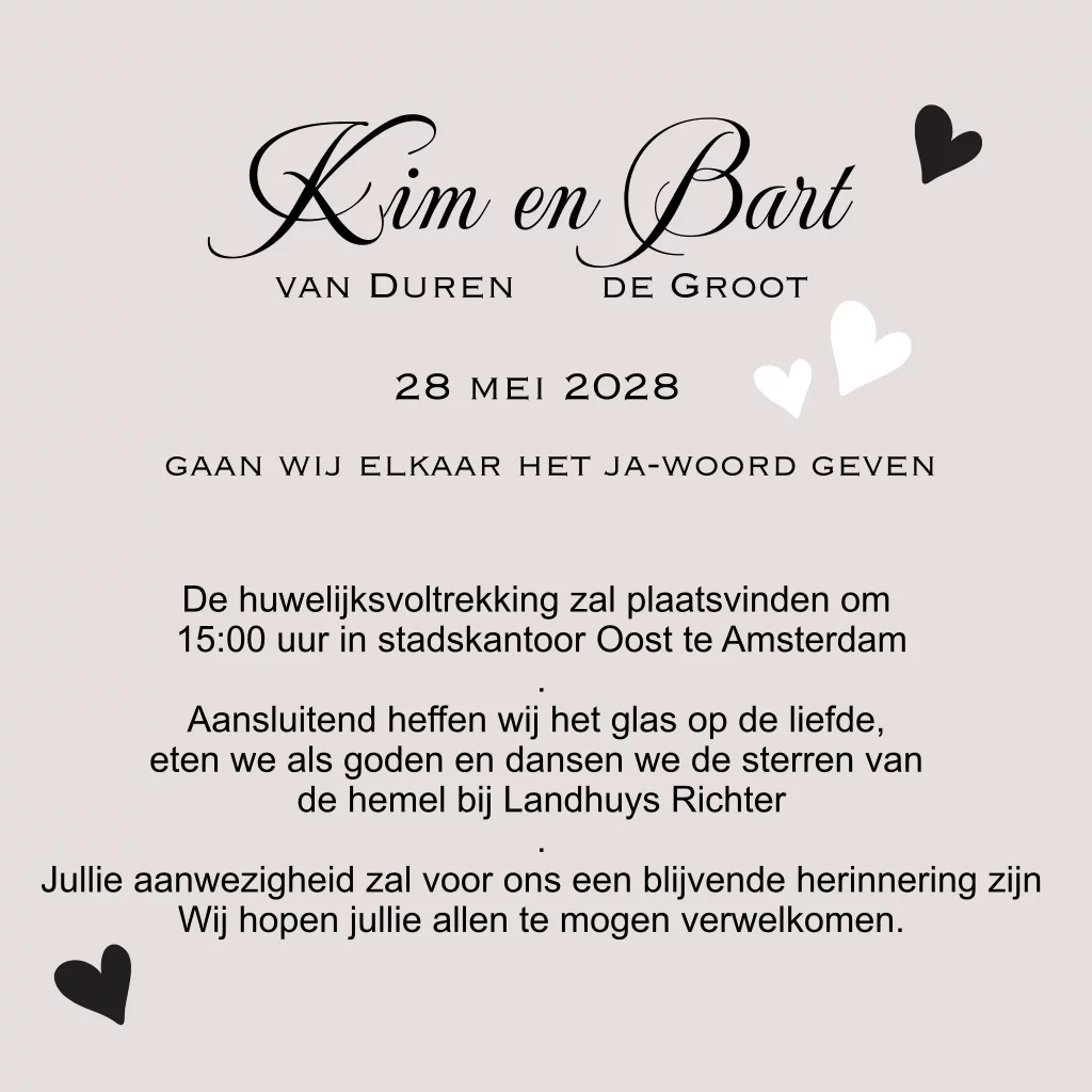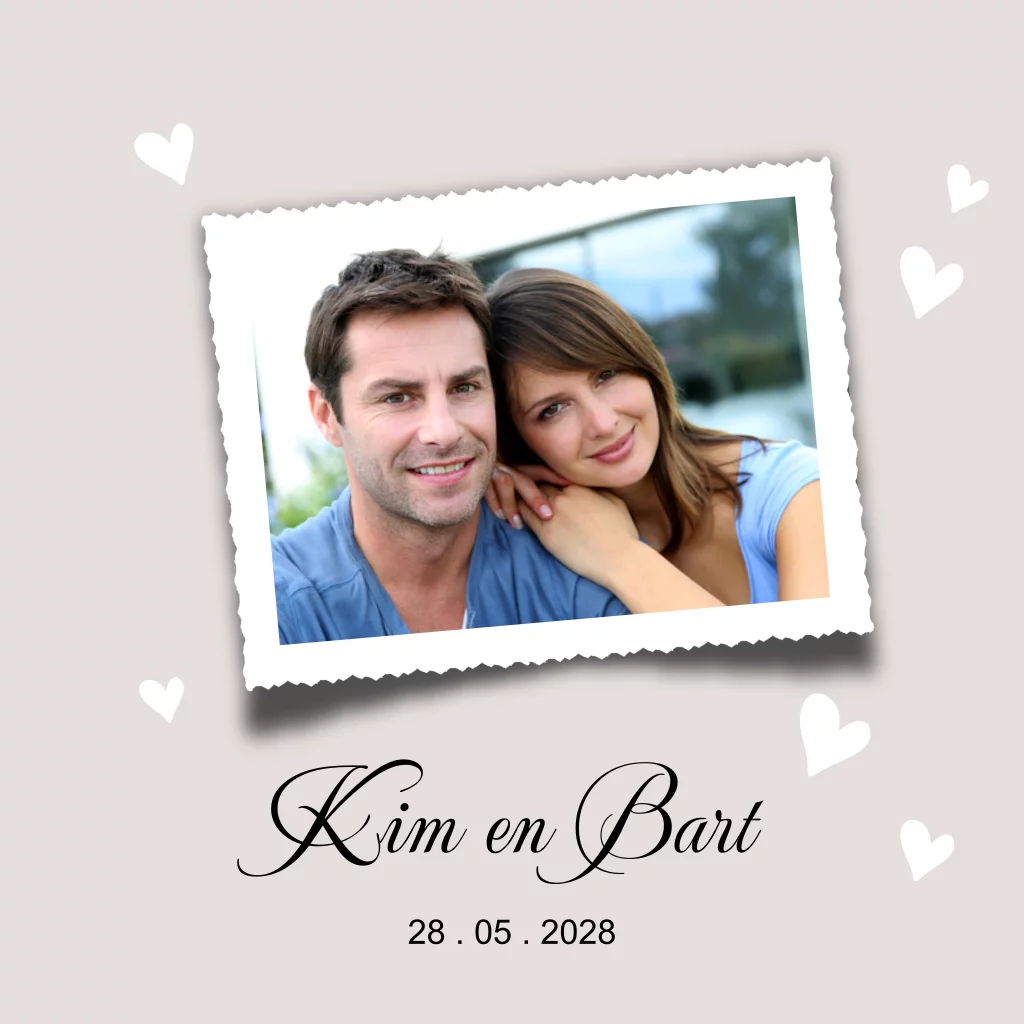 Foto trouwkaart met zacht roze grijze tint op de achtergrond en confetti hartjes. (3252)
