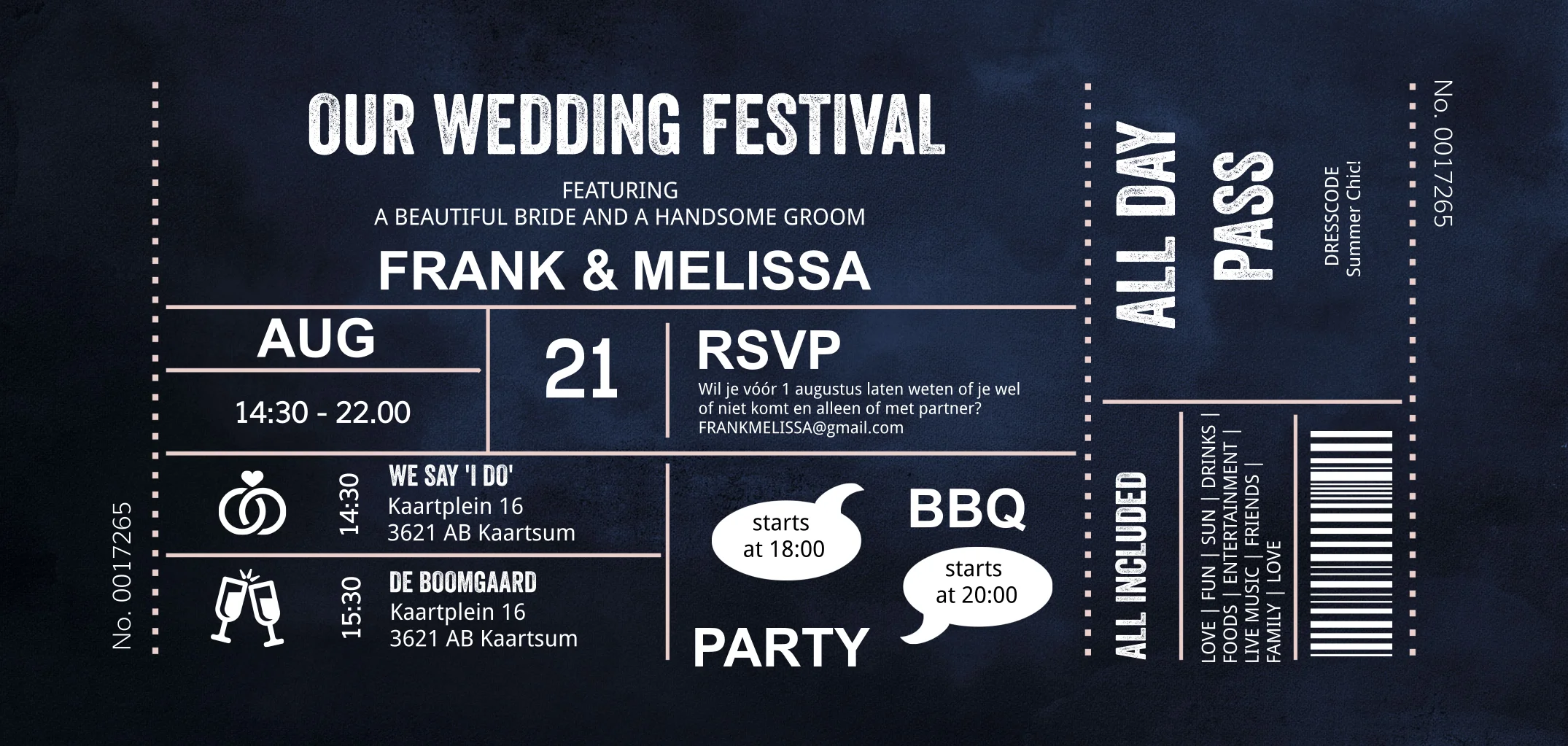 Trouwkaart in ticket vorm met blauwe waterverf achtergrond. (23031)