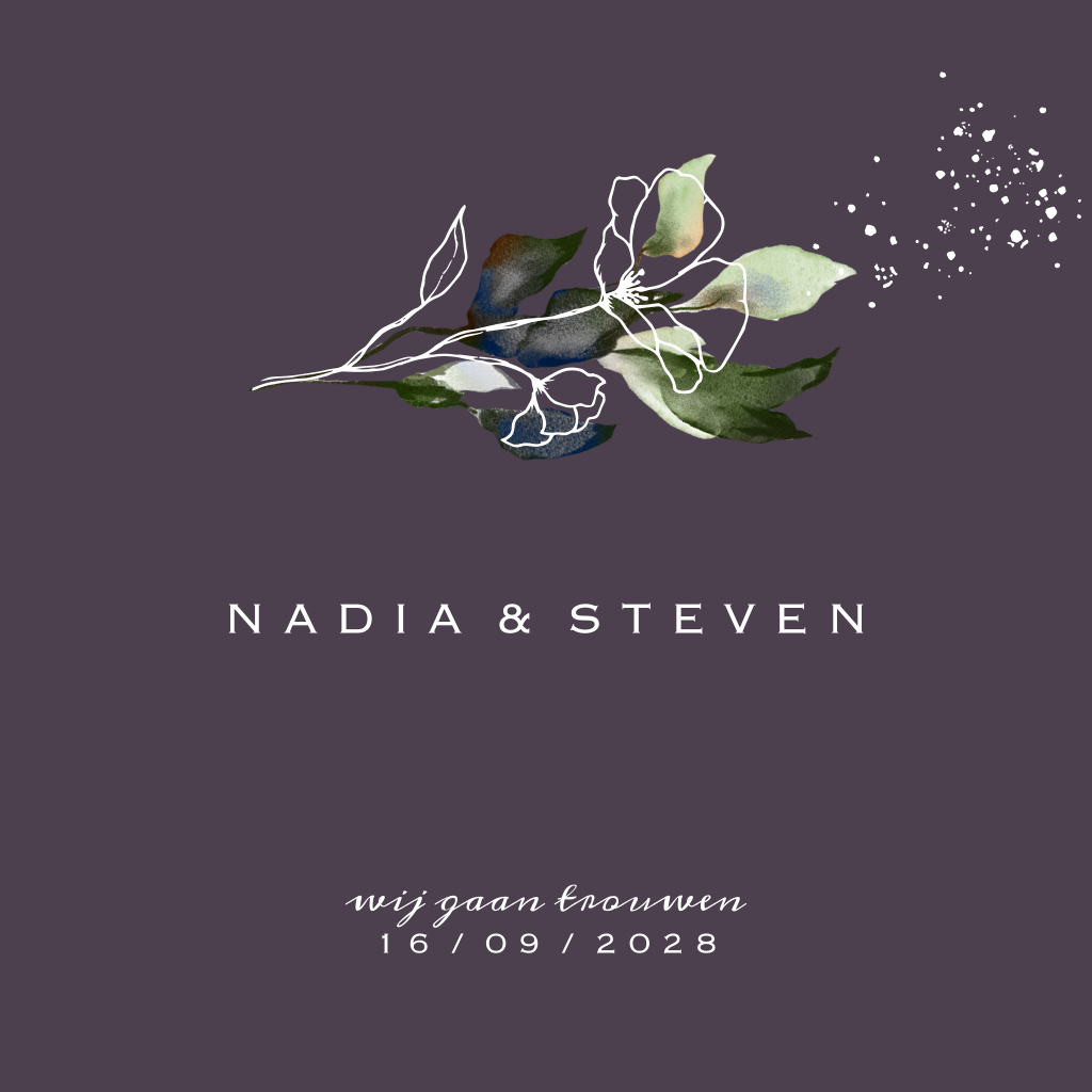 Trouwkaart met waterverf bloem, foliedruk en paarse achtergrond. (23031)