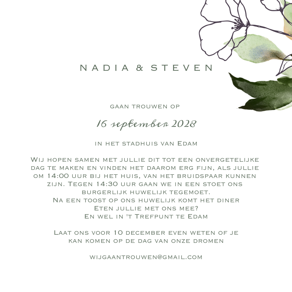 Trouwkaart warm paarse kleur met bloemen en foliedruk