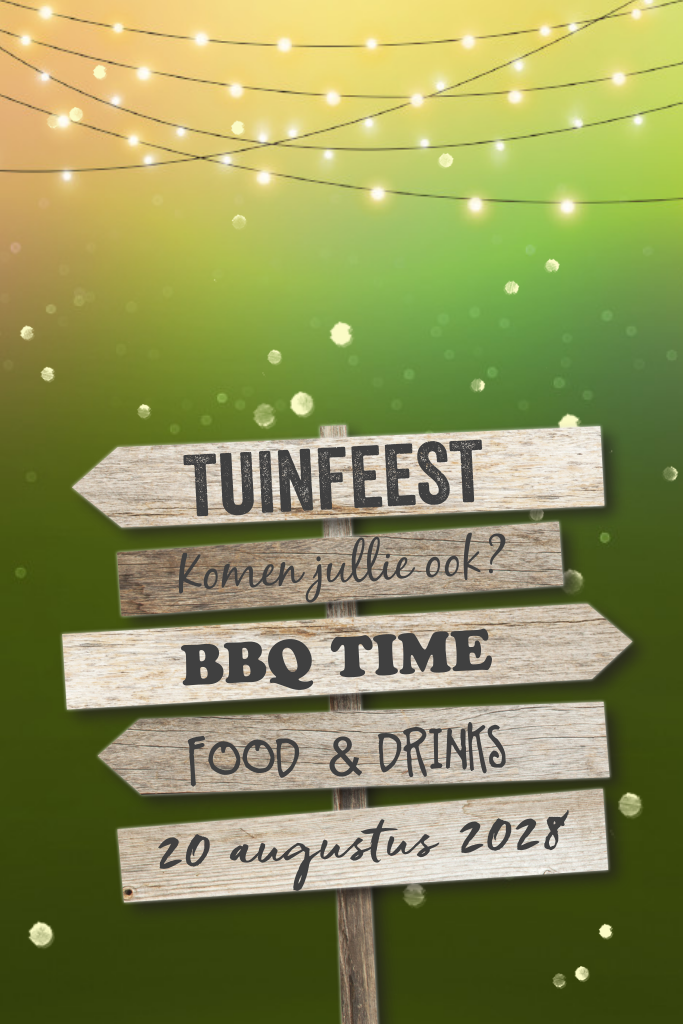 Tuinfeest bbq uitnodiging met houten borden en lampjes