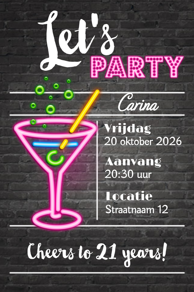 Uitnodiging 21 diner met cocktail met neon verlichting