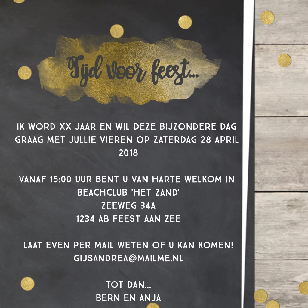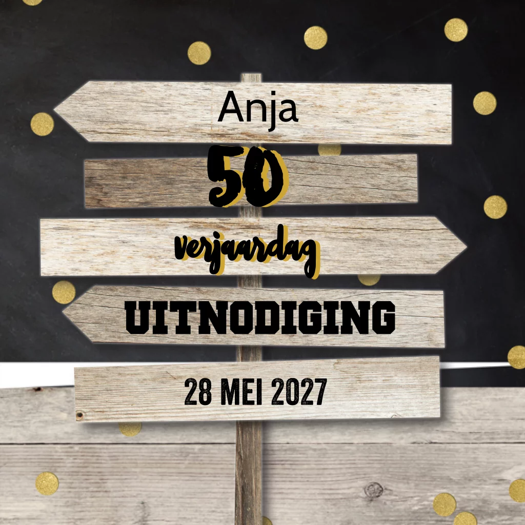 Uitnodiging 50e verjaardag met houten borden en confetti