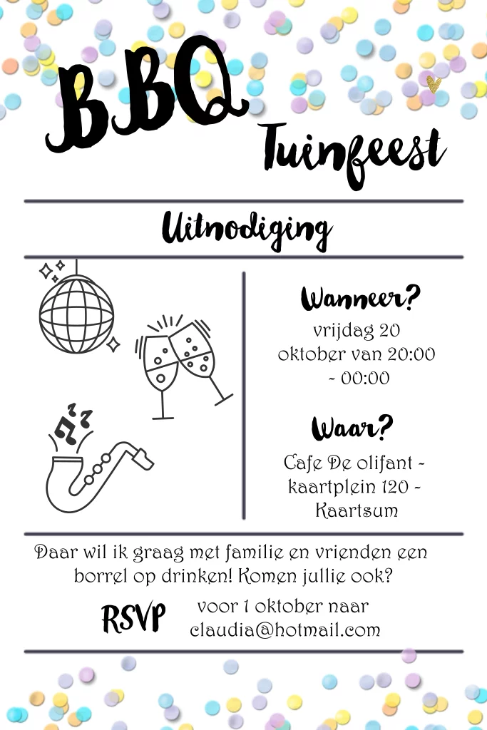 Uitnodiging bbq tuinfeest met lichte kleuren confetti en typografie