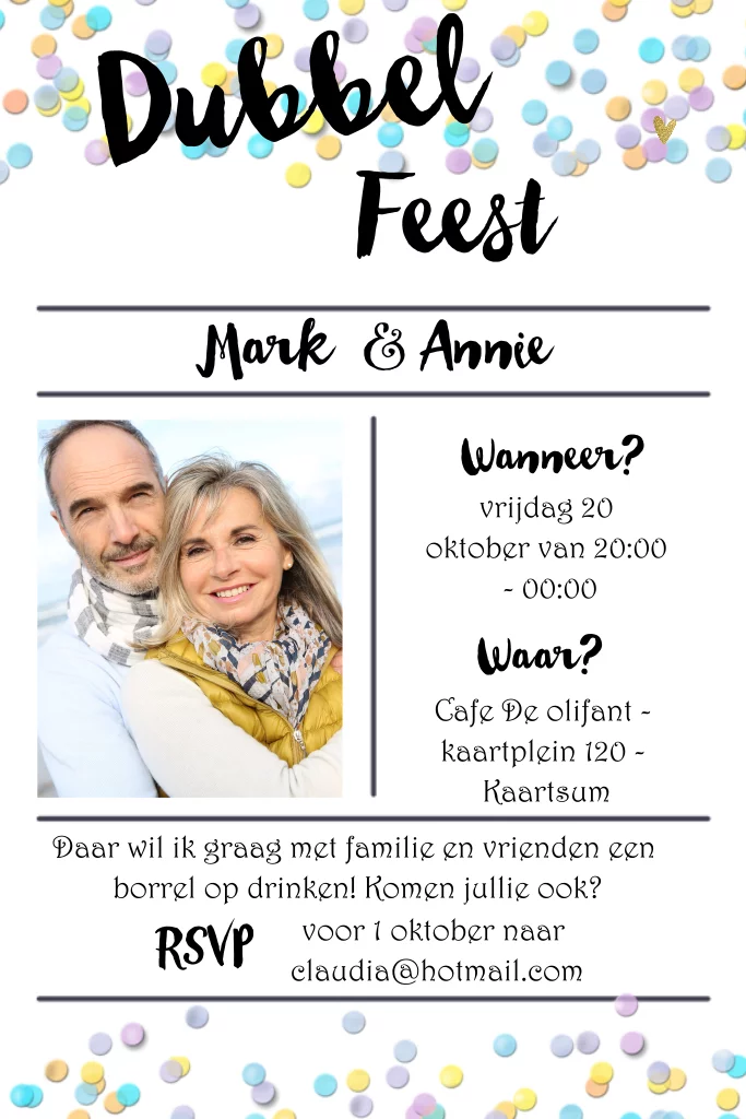 Uitnodiging dubbel feest met lichte kleuren confetti en typografie. Alles staat los op dit kaartje en is te bewerken. (5269)