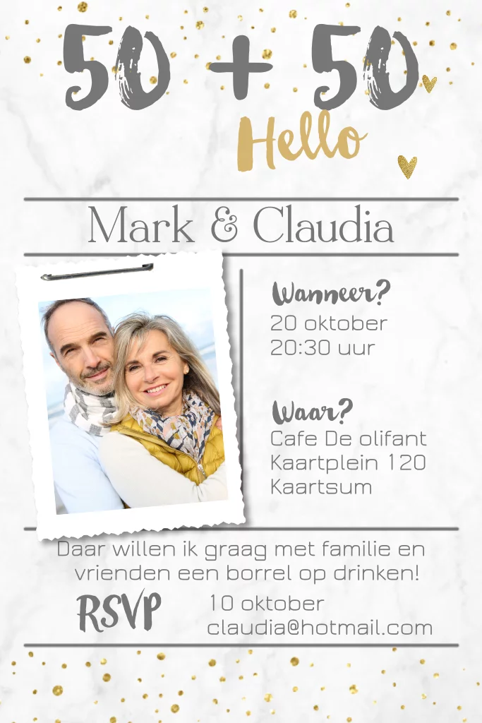 Uitnodiging dubbel feestje op marmer met goudkleurige glitters. Ruimte voor een eigen foto. Alles staat los op dit kaartje en is te bewerken. (5375)