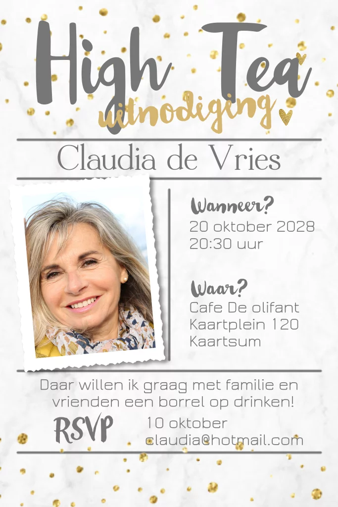 Uitnodiging high tea gouden glitters en foto