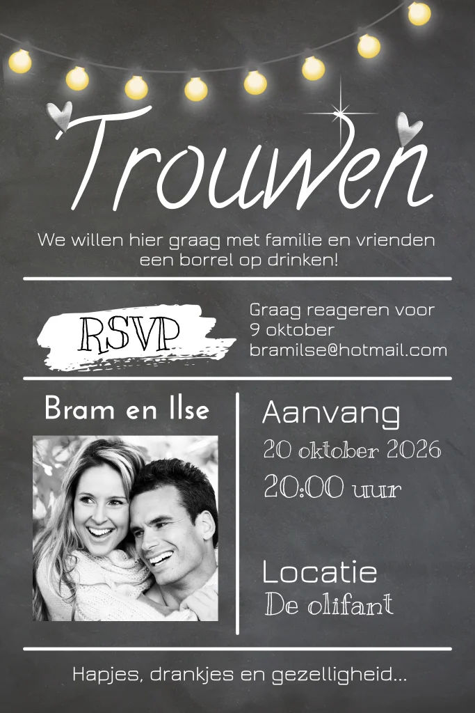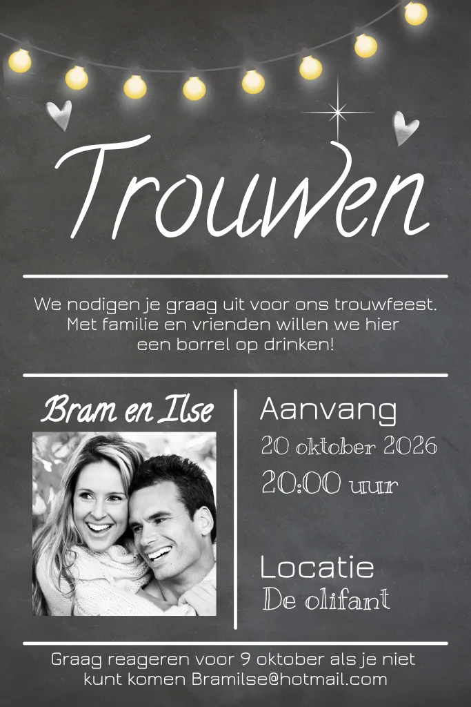 Uitnodiging bruiloft met zilver jaartal op krijtbord met typografie en lichtslinger. Alles staat los op dit kaartje en is te bewerken. (5243)