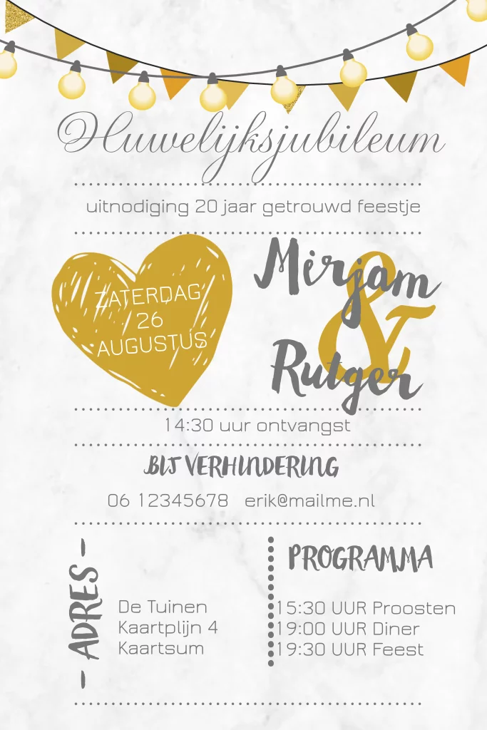Uitnodiging voor een huwelijksjubileum feest 20 jaar getrouwd op marmer-look. Alles staat los op dit kaartje en is te bewerken. (5370)