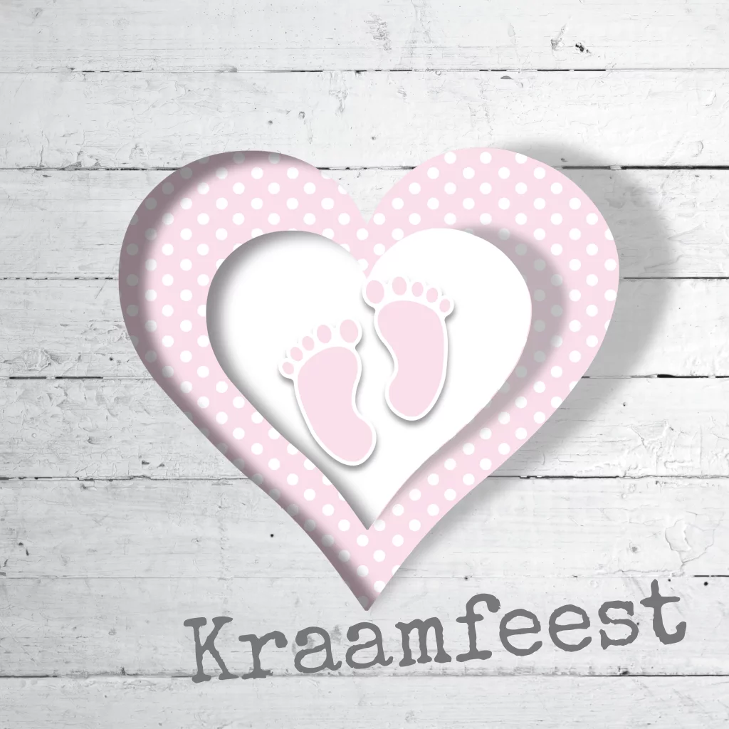 Kraamfeest uitnodiging meisje met ruitjes hart stippen voetjes. Op hout achtergrond(1705)