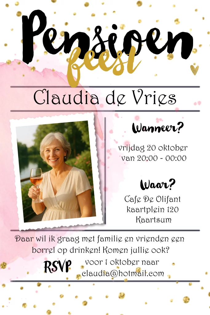 Uitnodiging pensioenfeest met roze confetti en typografie