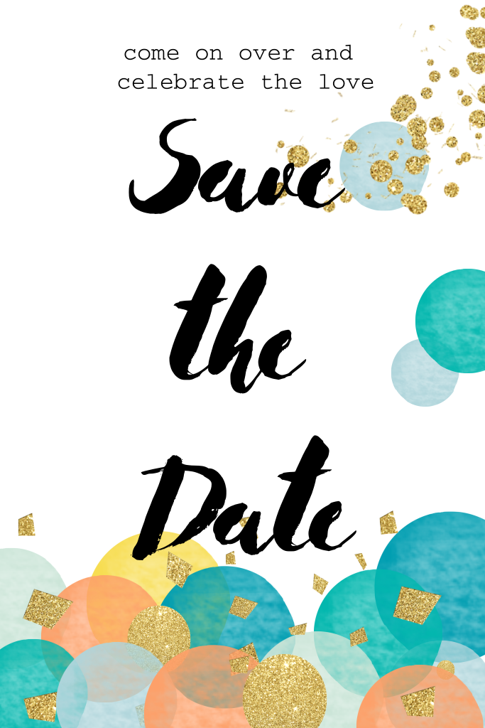 Uitnodiging huwelijk met blauw en groene confetti en goudkleurige glitters. Alles staat los op dit kaartje en is te bewerken. (5264)