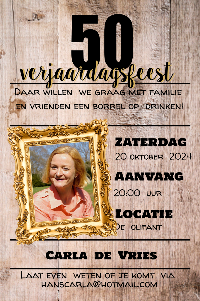 Uitnodiging voor een 50e verjaardag met hout en fotolijst