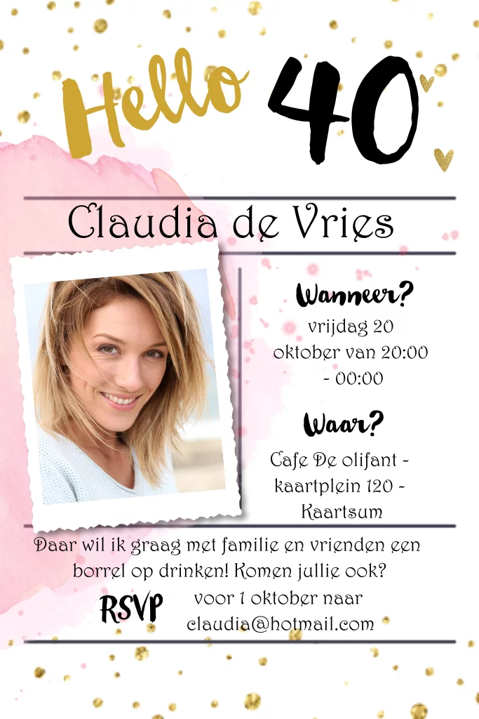 Uitnodiging verjaardag 40 jaar vrouw met roze confetti en typografie