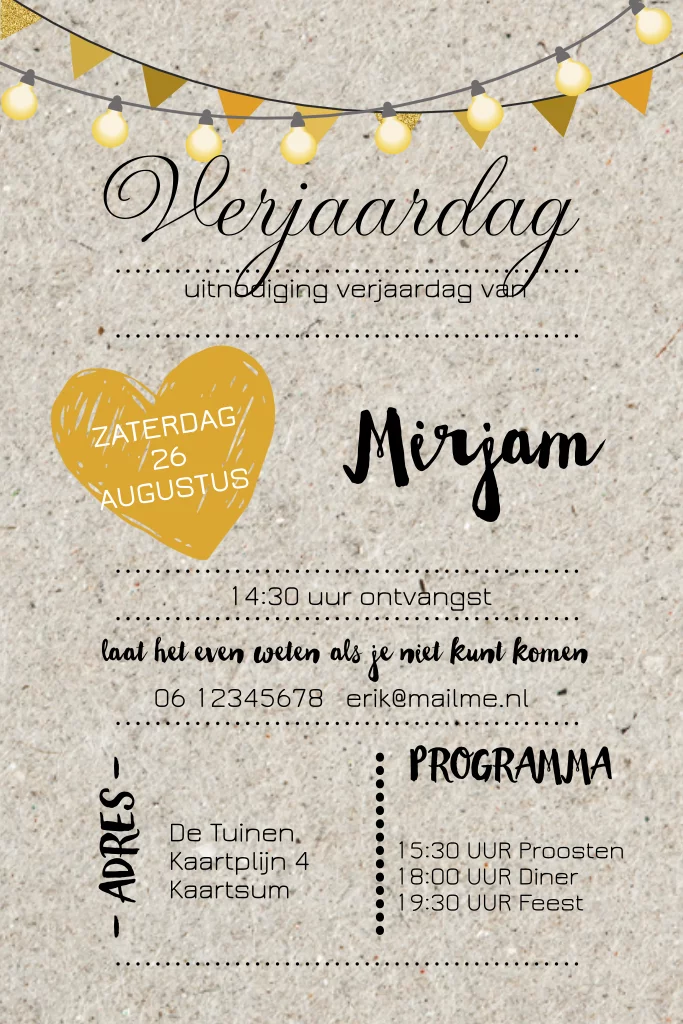 Uitnodiging voor een verjaardagsfeest op karton-look. Alles staat los op dit kaartje en is te bewerken. (5369)