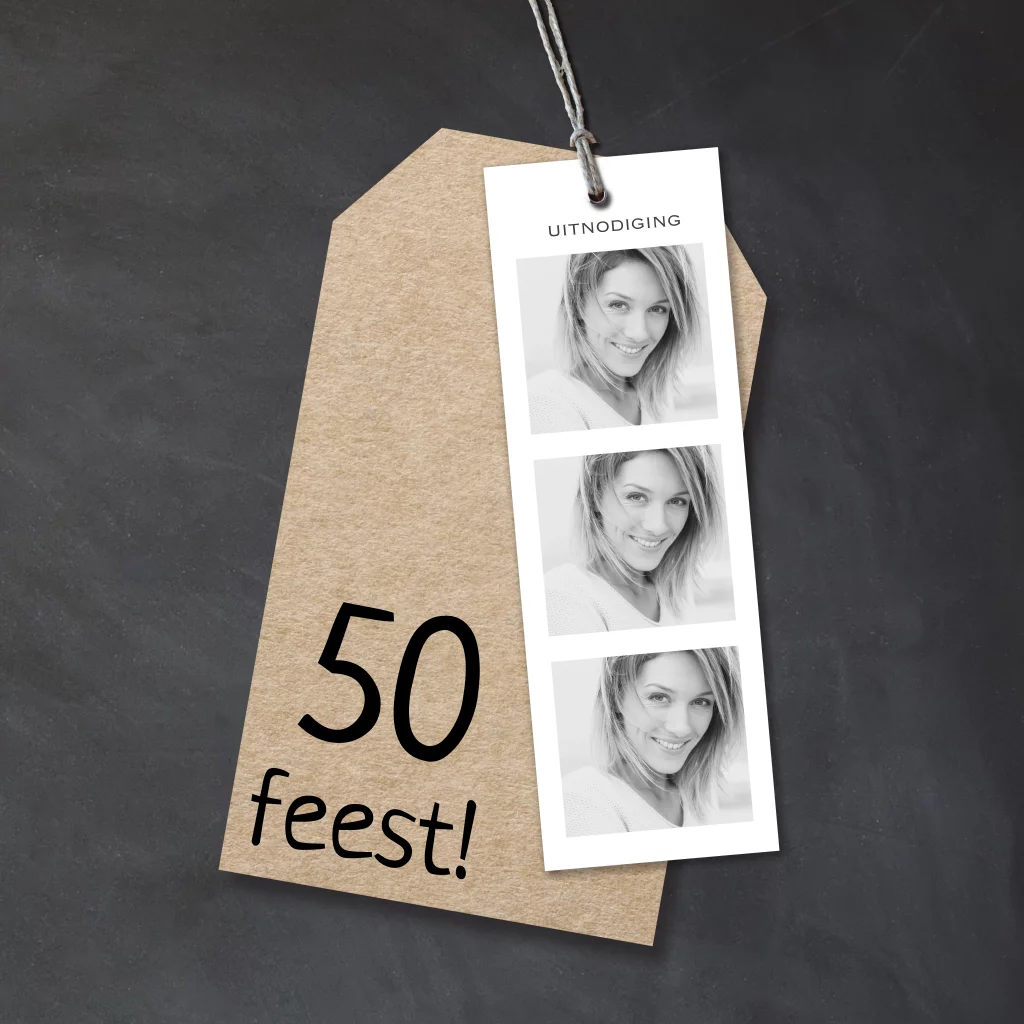 Uitnodiging voor een verjaardag met fotostrip en kraft vintage label. (3268)