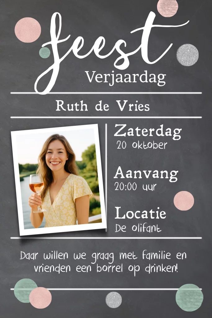 Uitnodiging verjaardag met rose goud en zilveren typografie
