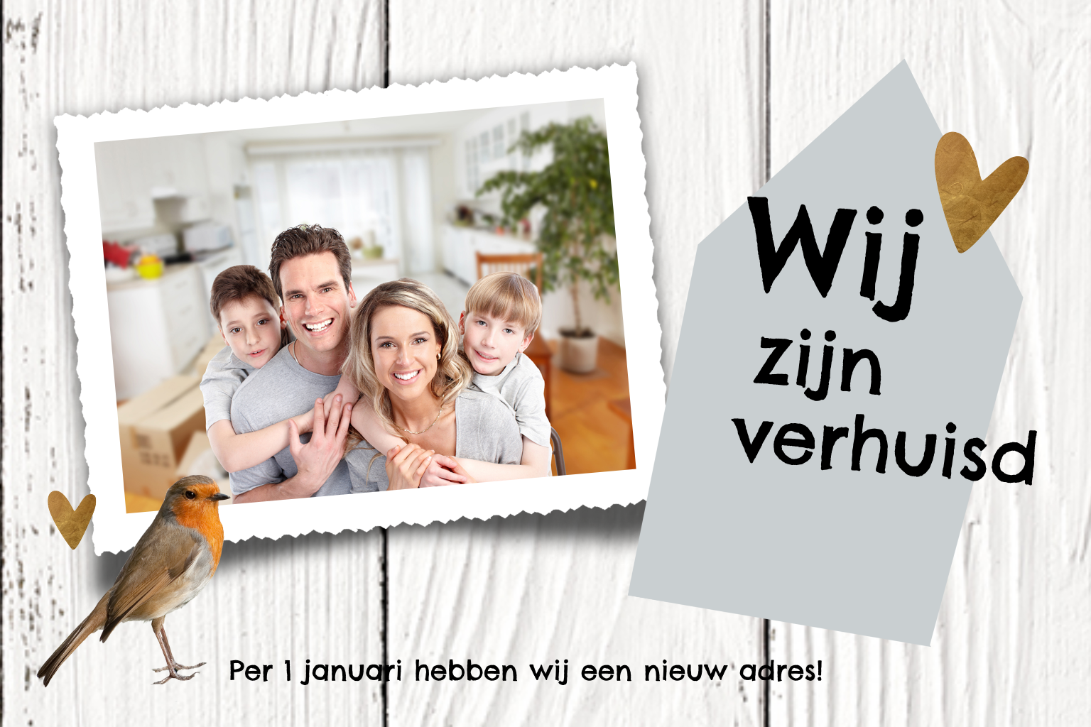Verhuiskaart met wit hout koper huis en label. (2471)
