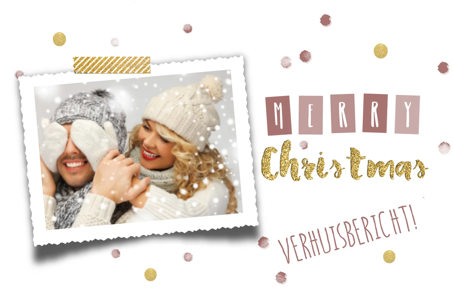 Kerst verhuisbericht met witte achtergrond. Versierd met eigen foto, spetters in oud roze en goudkleur. Kerstwens in oud roze en glitter goudkleur. Alles staat los op dit kaartje en is te bewerken. (3955)